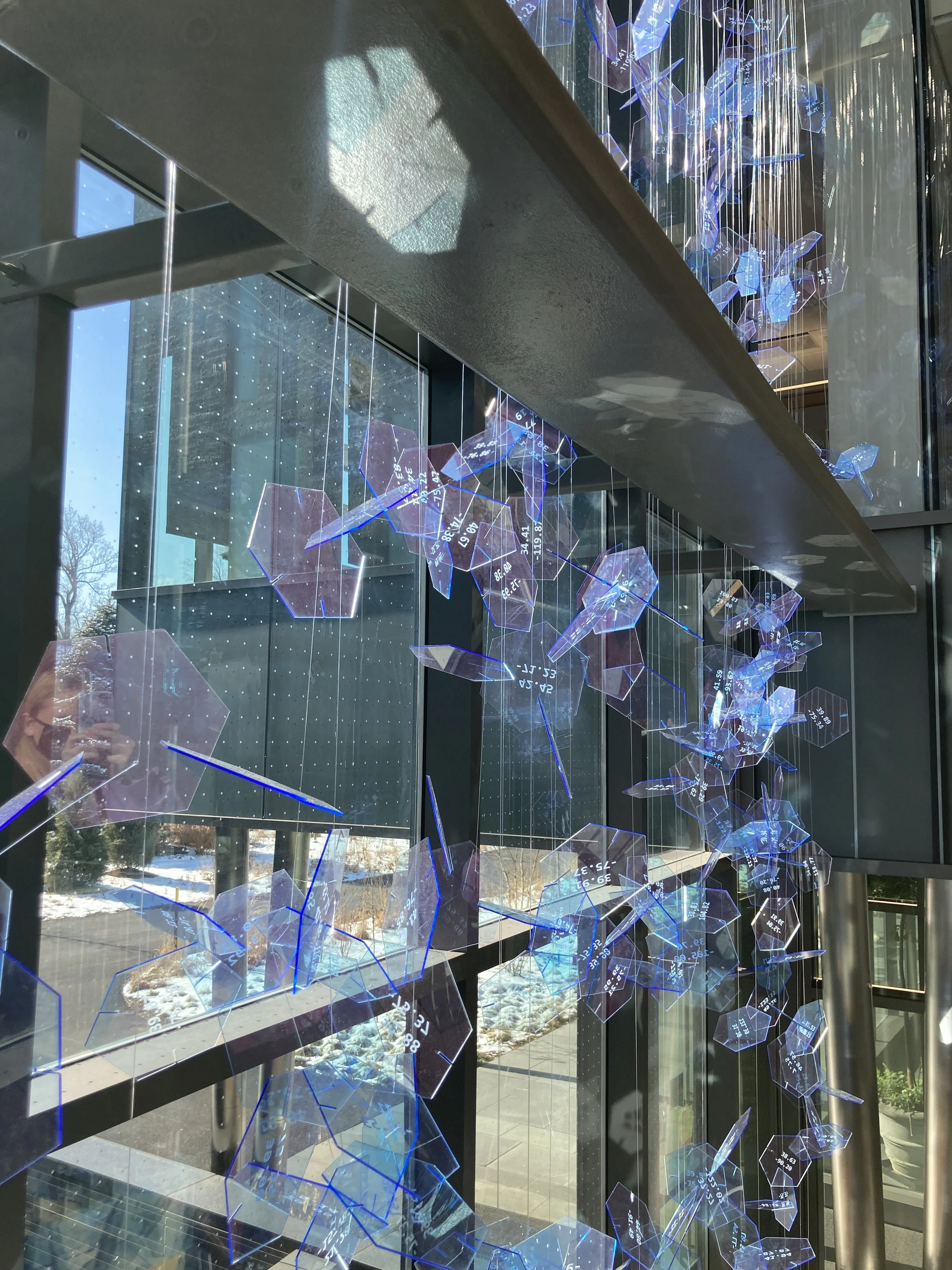 Parts of A Whole was created in collaboration with artist Erin Wheary in response to the COVID-19 pandemic. With the majority of the Swarthmore College campus working remotely in many different locations, and International students unable to travel to visit family, Erin and I collected geographic coordinates from Swarthmore College faculty, students, and staff. These coordinates were laser engraved on hexagonal tiles of blue edge-glow acrylic, assembled in clusters in a single installation, and hung in Singer Hall. The installation remains a reminder of the collaboration between community members during this challenging time.